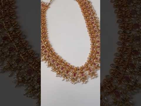 Achieve a regal bridal look with this antique gold temple long necklace. Featuring traditional artistry, vibrant stone accents, and cascading pearl clusters, this statement Rani Haar is the perfect centerpiece for weddings and festive occasions.